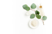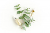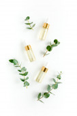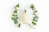 Olejek eteryczny, ekstrakt roślinny, serum, kwas hialuronowy, krem do twarzy, liście palmy tropikalnej na szarym marmurowym tle. Koncepcja pielęgnacji skóry Spa. Naturalne