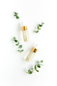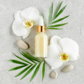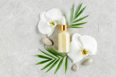 Zdjęcie "Olejek eteryczny, ekstrakt roślinny, serum, kwas hialuronowy, krem do twarzy, liście palmy tropikalnej na szarym marmurowym tle. Koncepcja pielęgnacji skóry Spa. Naturalne" może być wykorzystywane do celów osobistych i komercyjnych zgodnie z warunkami zakupionej licencji Royalty-free. Obraz jest dostępny do pobrania w jakości wysokiej rozdzielczości do 5760x3840.