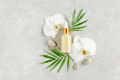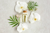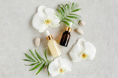 Olejek eteryczny, ekstrakt roślinny, serum, kwas hialuronowy, krem do twarzy, liście palmy tropikalnej na szarym marmurowym tle. Koncepcja pielęgnacji skóry Spa. Naturalne