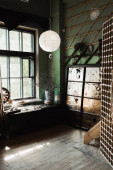 Nowoczesne wnętrze z betonowymi ścianami i żółtymi schodami w pobliżu roślin