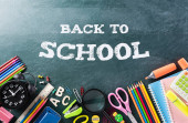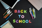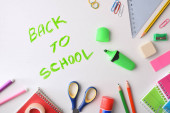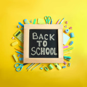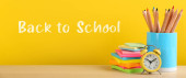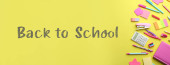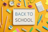 Zeszyt z tekstem Powrót do szkoły otoczony różną papeterią na żółtym, płaskim podłożu
