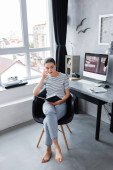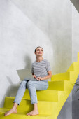 Zdjęcie "Selektywne skupienie młodej kobiety rozgrzewającej się w pobliżu laptopa na macie fitness w domu " może być wykorzystywane do celów osobistych i komercyjnych zgodnie z warunkami zakupionej licencji Royalty-free. Obraz jest dostępny do pobrania w jakości wysokiej rozdzielczości do 5760x3840.