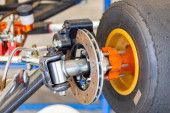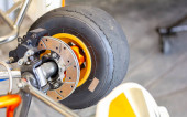 przednia metalowa rama lub struktura mini wyścigów samochodowych gokart lub skuter podczas parkowania na stacji benzynowej po zakończeniu zawodów