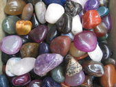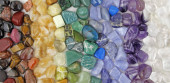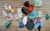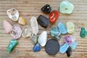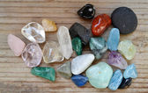 Które kamienie lecznicze cię przyciągają - wybór różnych kolorowych kryształów leczniczych na brązowym drewnianym tle