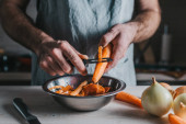 Przystojniak Peels Green Spring Cebula z rąk. Mężczyzna w białej koszuli i fartuchu przygotowuje organiczną sałatkę w nowoczesnej, słonecznej kuchni. Naturalna czysta dieta i zdrowy styl życia.