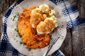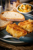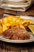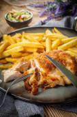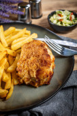 Pierś z kurczaka nadziewana bekonem i serem z frytkami i sałatką. Mała głębokość pola.