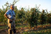 Portret starszego rolnika pracującego w sadach owoców jabłoni.