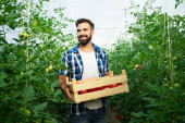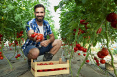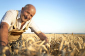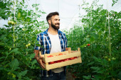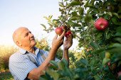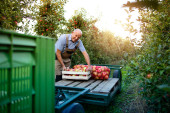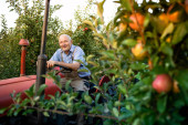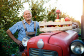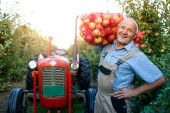 Portret pracownika gospodarstwa trzymającego worek pełen owoców jabłka. W tle stary ciągnik w stylu retro.