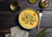 Pyszne risotto z dyni na szarym betonowym tle. Jesień smaczne jedzenie, widok z góry.