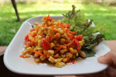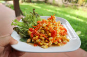 wymieszać smażone warzywa z wieprzowiną, sałatką warzywną