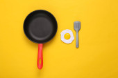 Kobieta trzyma patelnię i łopatkę do gotowania na żółtym tle. Widok z góry