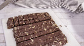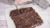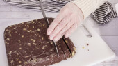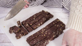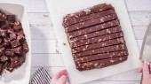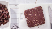 Krok po kroku. Cięcie domowej roboty krówki macadamia na białej desce do krojenia.