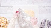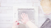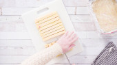 Leżeć płasko. Krok po kroku. Cięcie domowej roboty cukierków trzciny cukrowej na białej desce do krojenia.