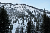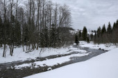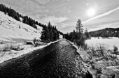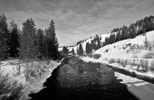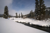 Świeży śnieżny krajobraz przez Grey River w Wyoming, USA zimą.
