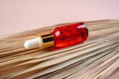 Młoda kobieta trzyma serum na twarz w rękach. Esencja dla zdrowia twarzy z ekstraktem z granatu. Kosmetyki antywiekowe do podnoszenia skóry. Serum w czerwonej szklanej butelce przeciw. Organiczny produkt wegański.