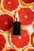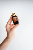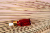Młoda kobieta trzymająca w dłoniach esencję dla zdrowia twarzy z ekstraktem z granatu. Kosmetyki antywiekowe do podnoszenia skóry. Serum w czerwonej szklanej butelce przeciw. Organiczny produkt wegański. Miejsce na tekst