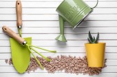 Narzędzia ogrodnicze i sprzęt na białym drewnianym tle. Przygotowuję się do sezonowej transplantacji roślin. Sadzenie w koncepcji ogrodu.