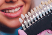 Zbliżenie portret pacjentki odwiedzającej stomatologa do wybielania zębów w klinice, zabieg wybielania zębów.