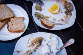 Resztki jedzenia i kości ryb na talerzu. Resztki obiadu na stole. Gryzione kości rybne po obiedzie