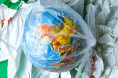 Światowa kula w niebieskiej plastikowej torbie. Zanieczyszczenie środowiska. Planeta jest w niebezpieczeństwie. Ludzka ręka próbuje ocalić świat.