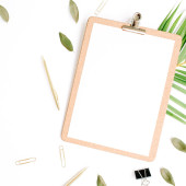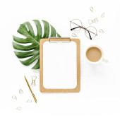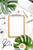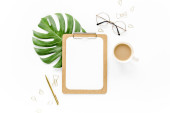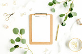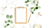 Zdjęcie "Obszar roboczy ze schowkiem i eukaliptusem liści na białym tle. Płaskie ułożenie biurka domowego, widok z góry. " może być wykorzystywane do celów osobistych i komercyjnych zgodnie z warunkami zakupionej licencji Royalty-free. Obraz jest dostępny do pobrania w jakości wysokiej rozdzielczości do 5760x3840.