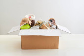 Skrzynka darowizn pełna różnych produktów na stole