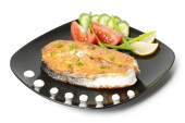 Naczynie rybne - smażony filet rybny z warzywami na białym tle