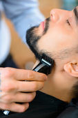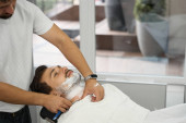 Brunetka mężczyzna przechyla głowę do tyłu i jego wąsy woskowane