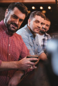 Wesoły mężczyzna trzymający szklankę whisky w salonie fryzjerskim