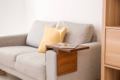 Szklanka wody i telefon komórkowy na podłokietniku w pokoju