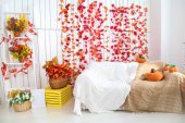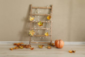 Zdjęcie "Różne wielobarwne dekoracyjne dynie z żółtymi liśćmi na drewnianej półce z białą ścianą. Jesień lub jesień wystrój wnętrz domu." może być wykorzystywane do celów osobistych i komercyjnych zgodnie z warunkami zakupionej licencji Royalty-free. Obraz jest dostępny do pobrania w jakości wysokiej rozdzielczości do 5760x3840.