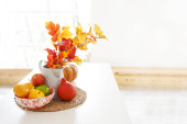 Różne wielobarwne dekoracyjne dynie z żółtymi liśćmi na drewnianej półce z białą ścianą. Jesień lub jesień wystrój wnętrz domu.