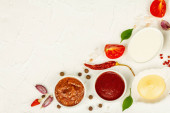 Lody arbuzowe lub sorbet z płatkami kokosowymi, orzechami włoskimi i świeżymi liśćmi bazylii. Słodki zdrowy deser, czarny kamień betonowe tło, widok z góry