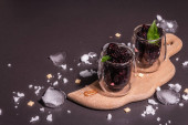 Lody arbuzowe lub sorbet z płatkami kokosowymi, orzechami włoskimi i świeżymi liśćmi bazylii. Słodki zdrowy deser, czarny kamień betonowe tło, przestrzeń kopiowania