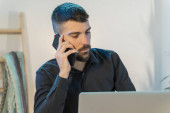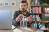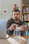 Biznesmen pracujący w domu z komputerem. Mała firma pracująca i robiąca interesy. Praca w domu podczas kwarantanny. Małe biuro. Koronawirus. Żel do dezynfekcji twarzy i maska.
