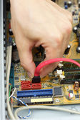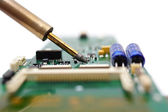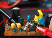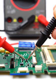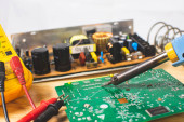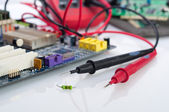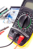 Multimetr i elektroniczne części zapasowe na białym tle na biały bac