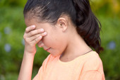słodkie mała dziewczynka noszenie czerwony sukienka to uczucie smutku na żółtym tle