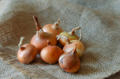 Grupa surowych brązowych żarówek na worku. Prawdziwy rolniczy warzywo w skórka z brud i kurz. Uprawa warzyw. Produkty rolne