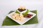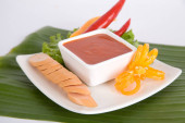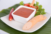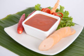 Kiełbasa w plasterkach na białym talerzu serwowana z sosem chili
