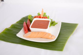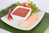 Kiełbasa w plasterkach na białym talerzu serwowana z sosem chili