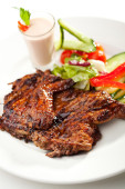 Gotowe. Grillowana szyja wieprzowa podawana z frytkami lub chlebem i sałatką, podawana na tackach papierowych. Widok z przodu.