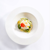Łosoś bułka z serem Philadelphia i marynowaną dynią, w papierze ryżowym z daikonem i sosem Ponzu. danie panazjatyckie.