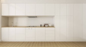 3D renderowanie nowoczesnego wnętrza kuchni ze stołem drewnianym na tle natury.