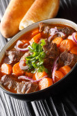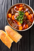 Autentyczny wietnamski gulasz wołowy Bo Kho zbliżenie w misce na stole. Poziomy widok z góry z góry