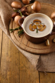 Kompozycja z Zupa grzybowa w garnku, świeże i suszone grzyby, na drewnianym stole, na tle worze