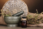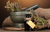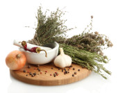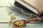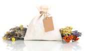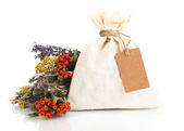 textiel zakje etui met gedroogde bloemen, kruiden en bessen, geïsoleerd op wit
