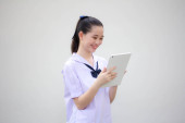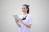 azjatyckie tajski gimnazjum student mundur piękna dziewczyna za pomocą jej telefon i uśmiech