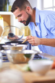 Człowiek po przepis na cyfrową tabletkę i gotowanie smaczne i zdrowe jedzenie w kuchni w domu