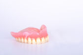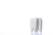 Trzy szczoteczki do zębów w ceramicznym stojaku w kształcie zęba izolowane na białym tle