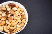 Pistacje Nut sól zmieszana w drewnianym talerzu jest białko żywności i zdrowej żywności dla żywności dietetycznej na czarnym tle.